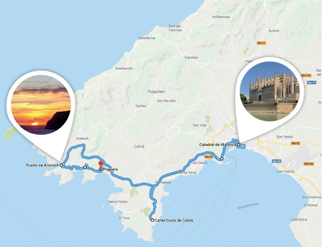 For your third stop, depending on the time and traffic, stop in Port Andratx, an exclusive and beautiful area in the southwest of the island. From there, return to the office passing the mountains with beautiful views of the golf camps of Camp de Mar.